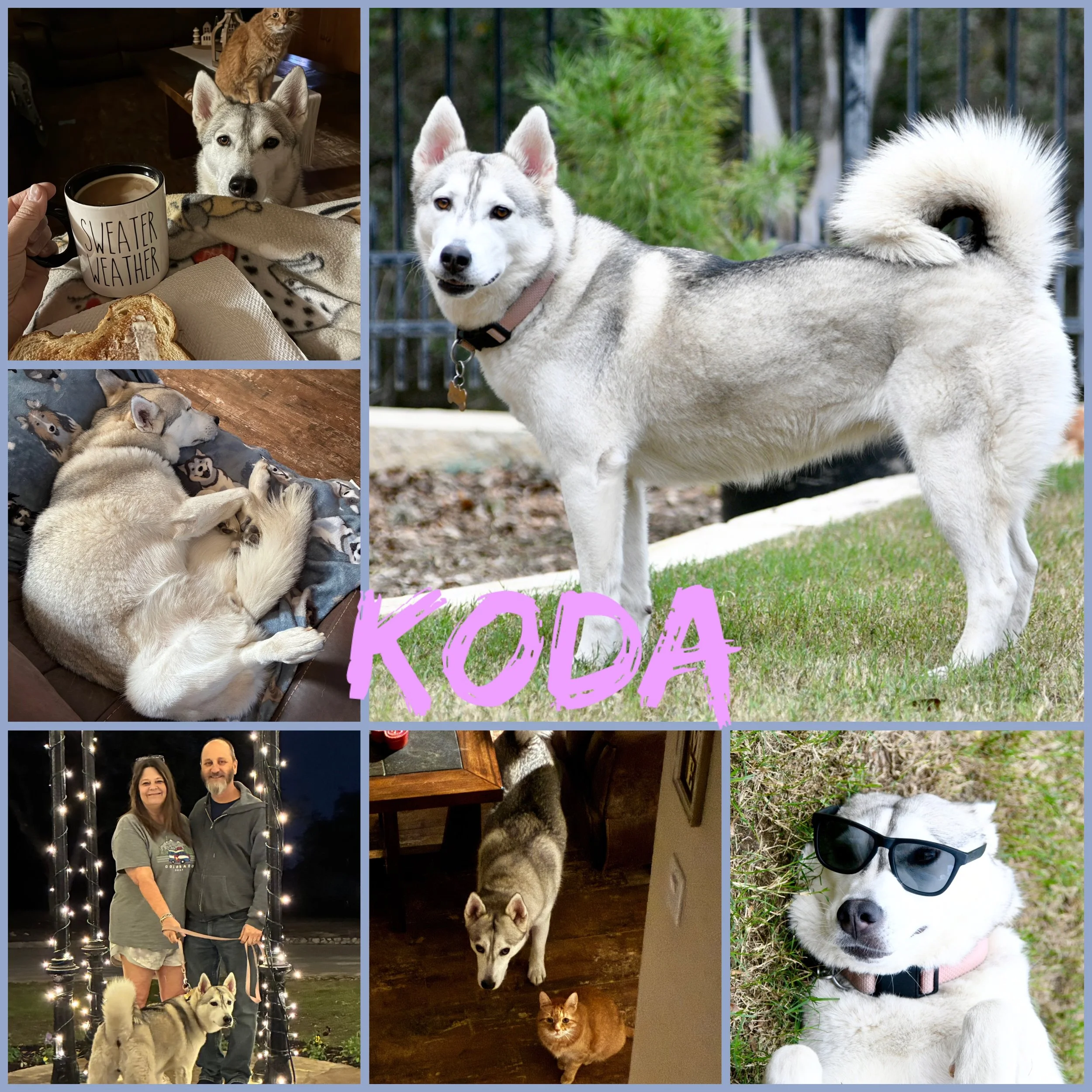 Since we first met Koda, I don’t feel like her personality has really changed. She seemed pretty happy and full of life when my daughter was fostering her. I am not exactly sure how she acted when she was actually in the shelter. Koda’s favorite treat is Beggin’ Strips. She loves walks, and playing with her toys. She loves to ‘sing’ along while my husband plays the harmonica. We spent many months feeling lost and sad without having our Blue around. When we adopted Koda, it brought a lot of joy back into our house. Everyone and I mean everyone loves Koda. Our whole family and neighbors adore her. She has been a great addition to our family. Even my cat Aj tolerates her and that says alot!!