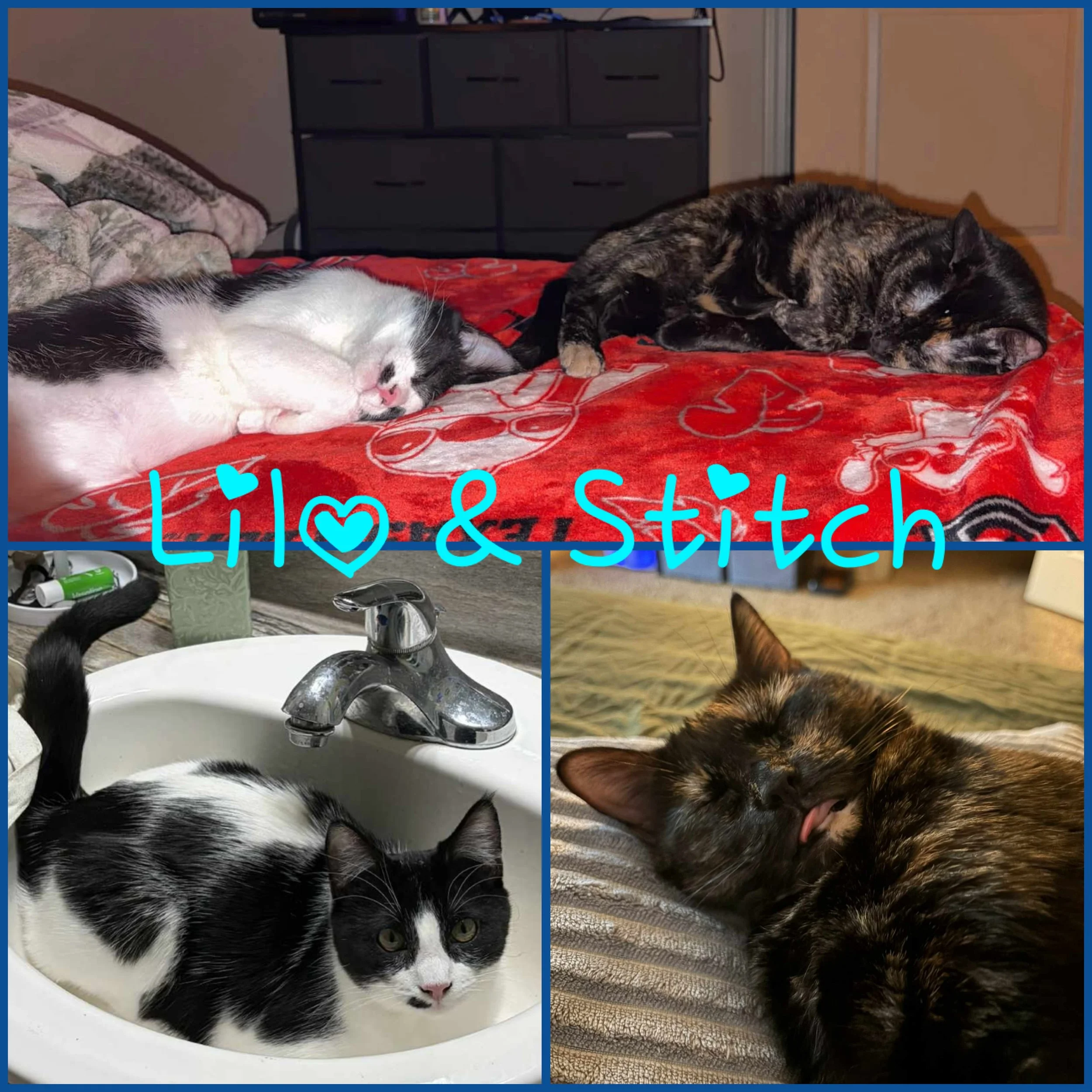 I met Lilo (previously nillie) October of 2024. she was super nervous but slowly became more talkative and very cuddly. She loves seeing people (that she knows), watching birds, and cuddling on her specific pillow. I got Stitch a couple months ago (previously bug) when I realized Lilo needed a friend. he is very curious and loves all people, and loves to try and lay in the sink 🤣. Lilo wasn’t a fan at first but they love playing together now and I'm super happy with my decision. both of them might be a little crazy sometimes but i wouldn’t trade it for the world. If anyone is considering adopting a cat i would say go for it 100% but also know you can’t change them, but they will change you.❤️